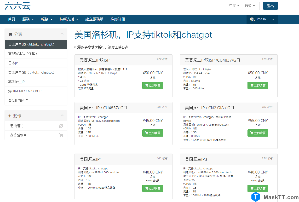 六六云 美国原生IP双ISP 支持tiktok和chatgpt 双向T1T流量 美西VPS 助力TikTok业务